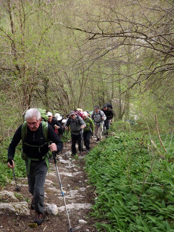 Départ Estupas sur sentier bordé par prairie d'ail des ours. -