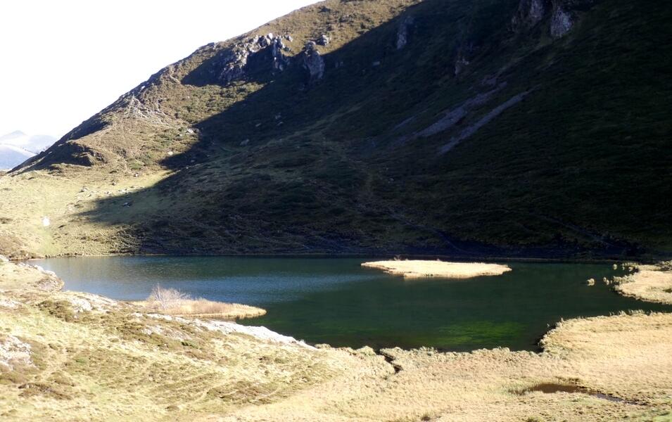 Après le cap d'Aygue Rouye 2005 m, le pas de la Crabe partiellement enneigé -