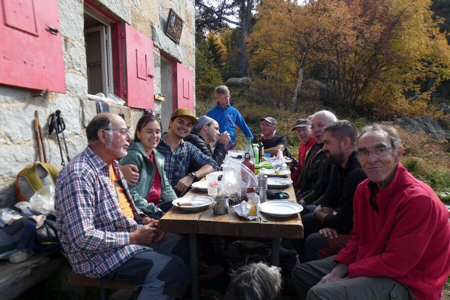 Pause casse-croûte sur la terrasse du refuge, -