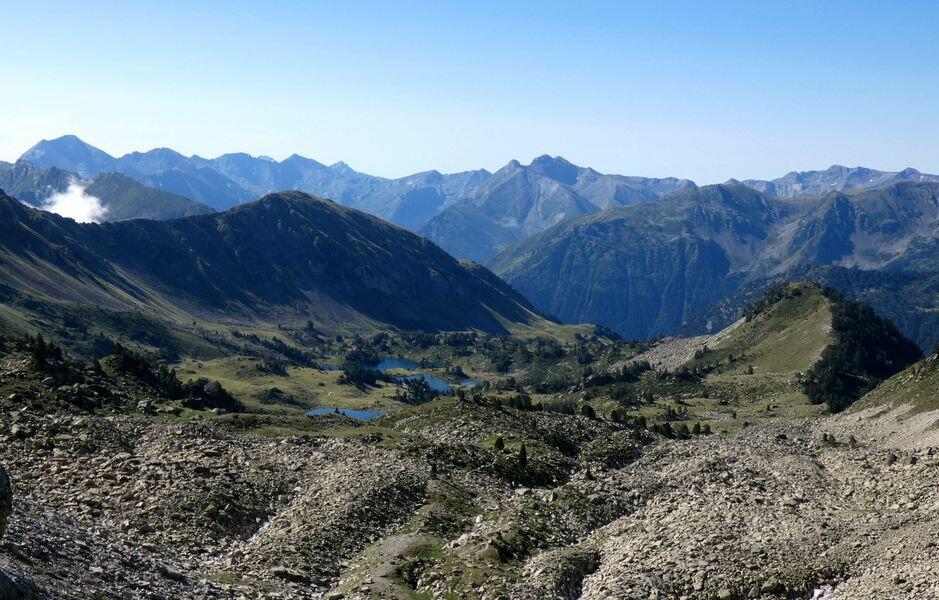 la hourquette de Caderolles, son lac, et derrière les lacs de Port-Bielh et Gourg Nère -